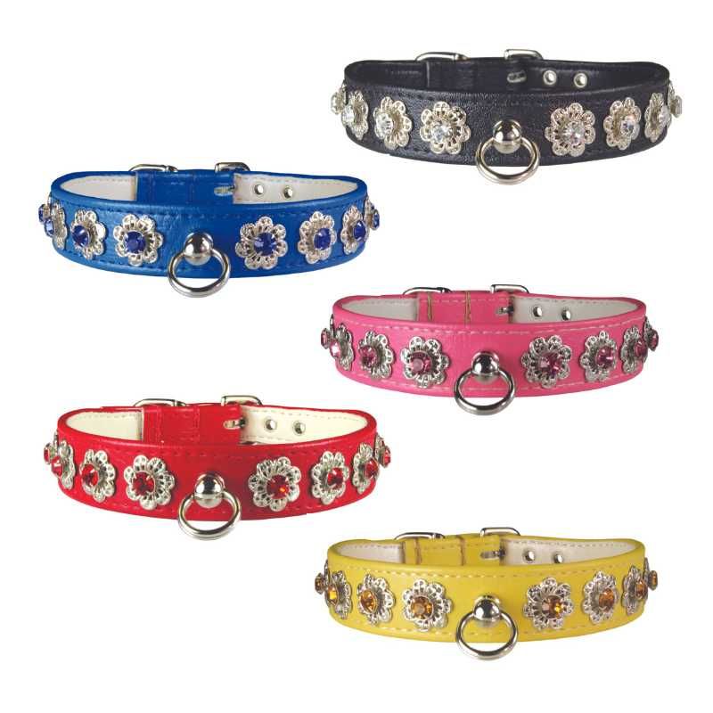Our Starburst vinyl dog collars have rhinestone crystals that are secured in a jeweled filigree setting.